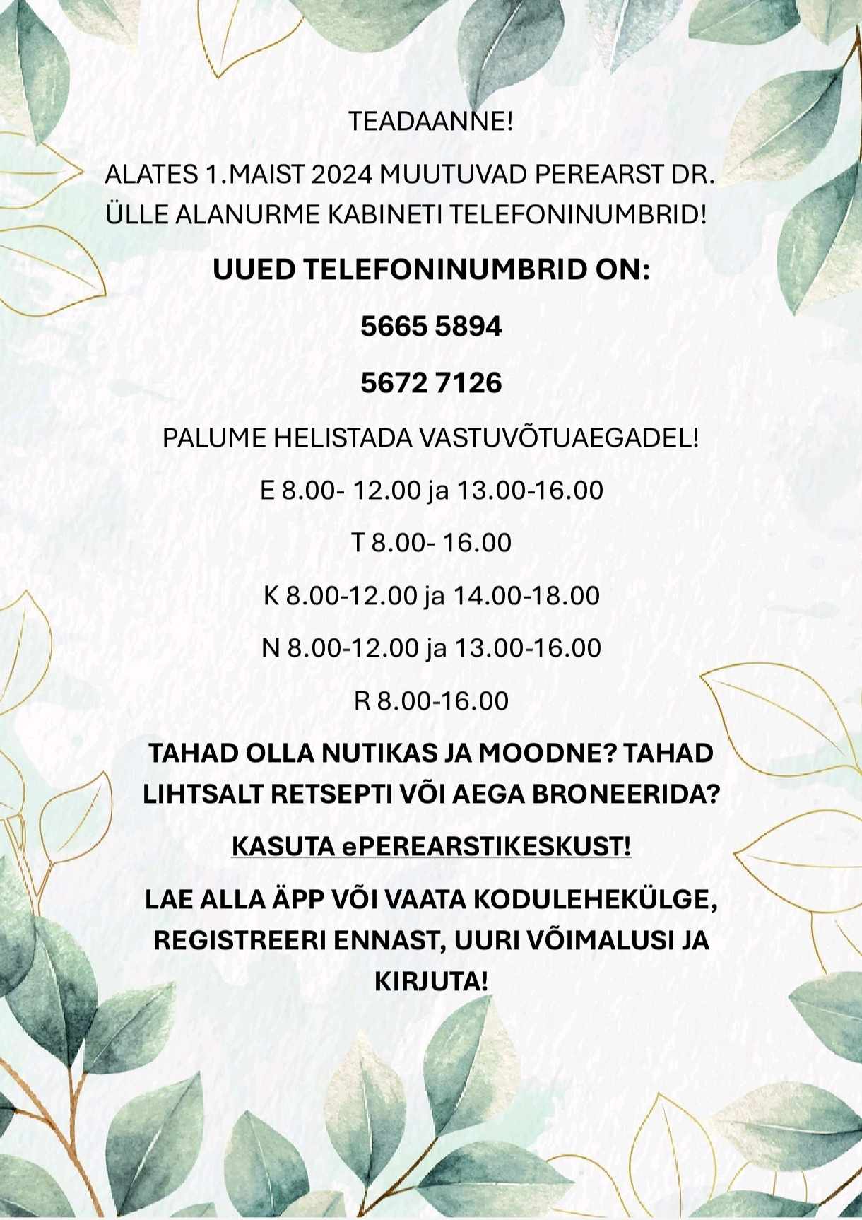 Dr Ülle Alanurme kabineti telefonid on 5665 5894 ja 5672 7126